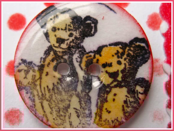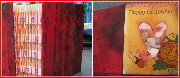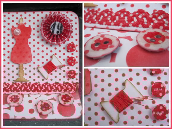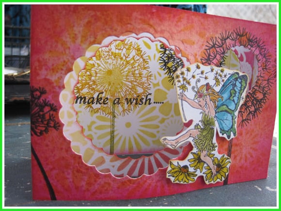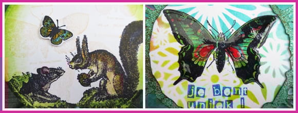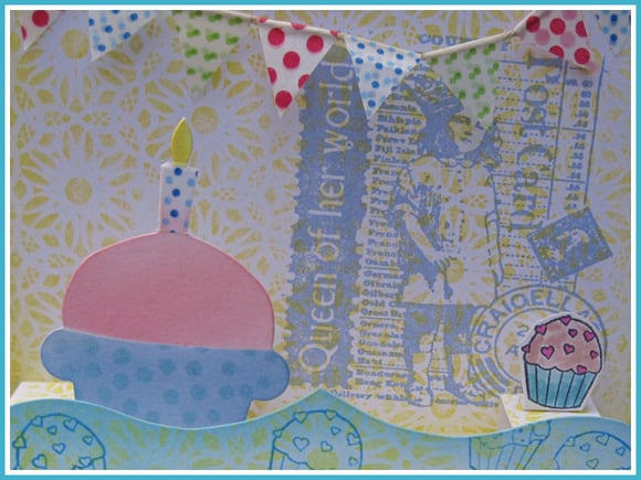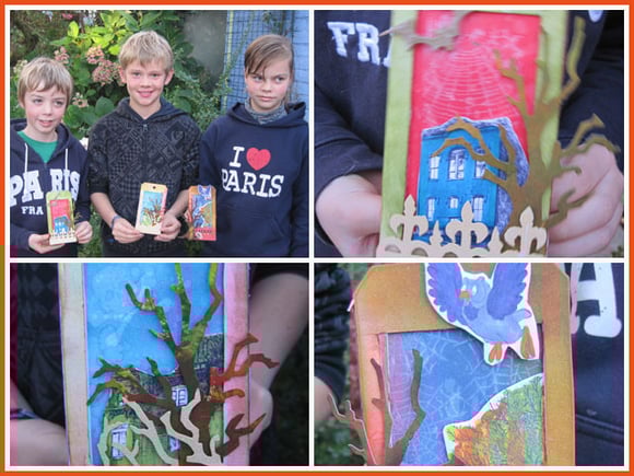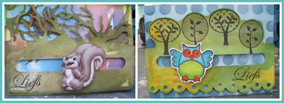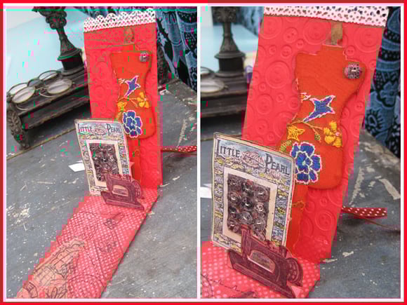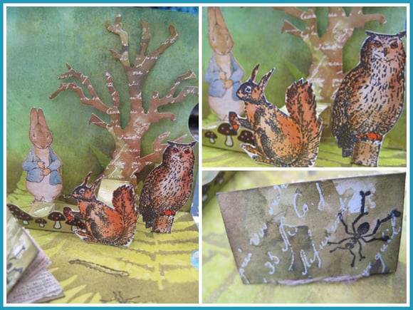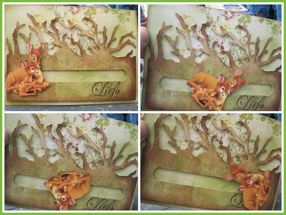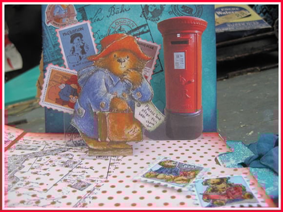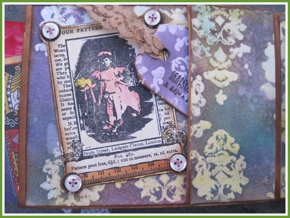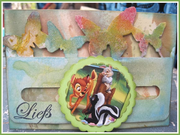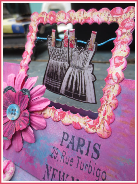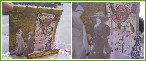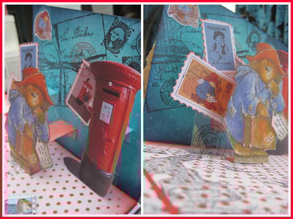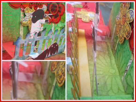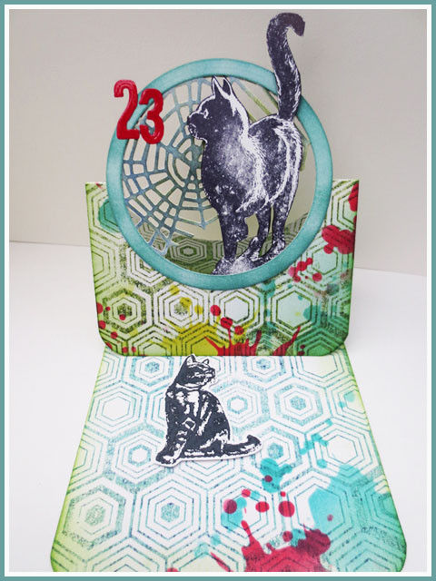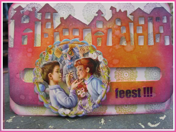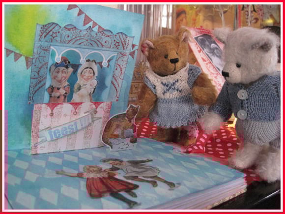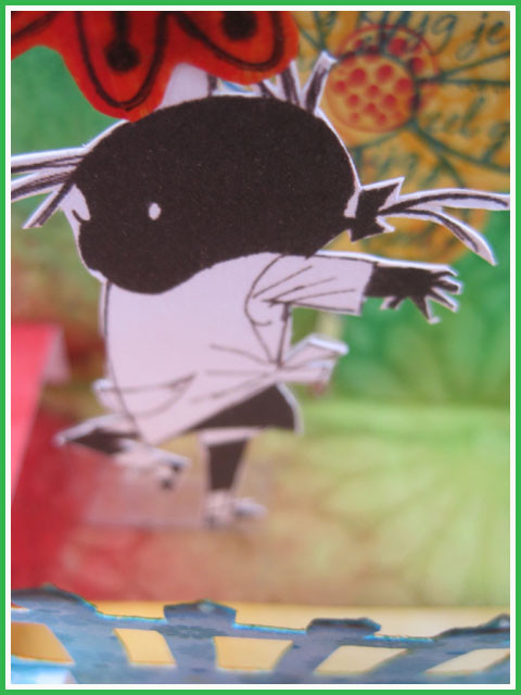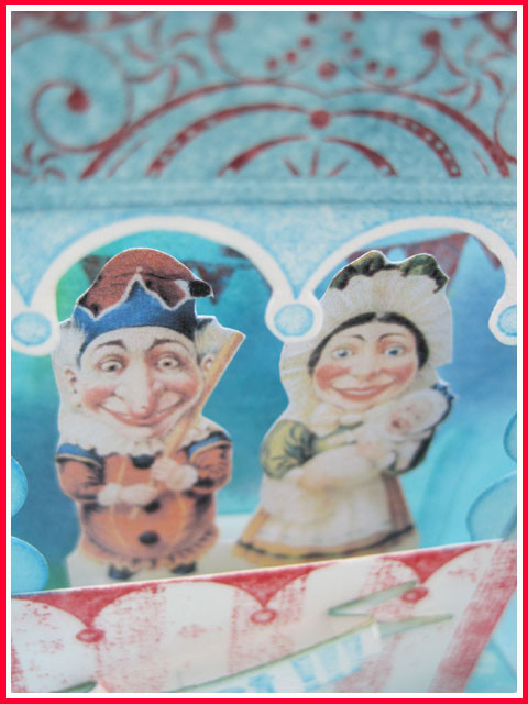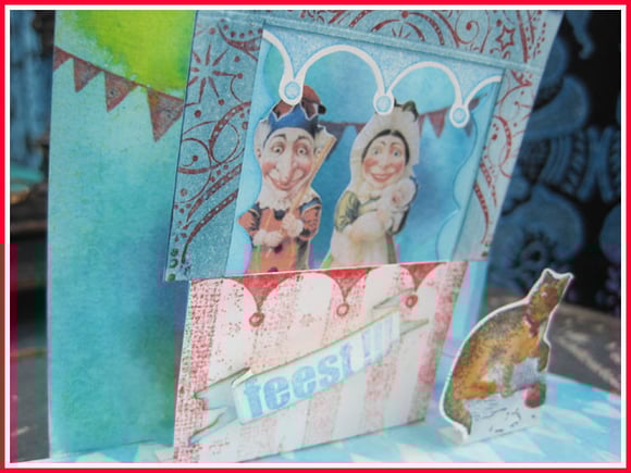 It's hard to see on photo I think, but the images of Punch and Judy ( images from the internet), the selfmade puppetry and the stamped cat are on three different levels attached with tabs on the flap, so they give dimension to the card.