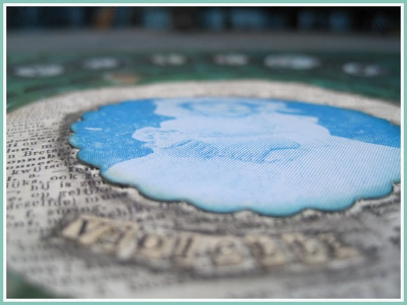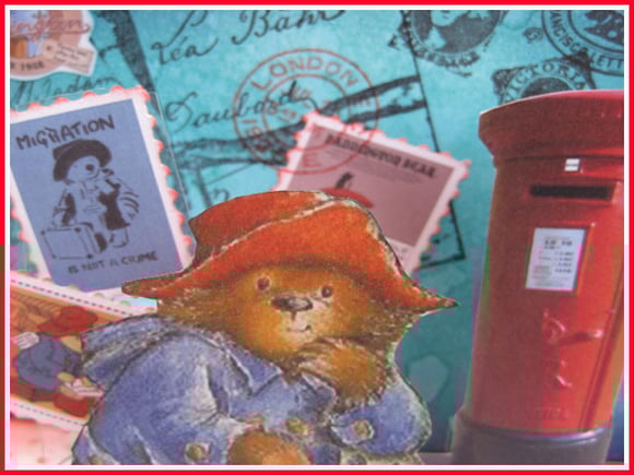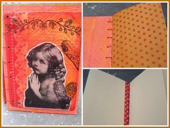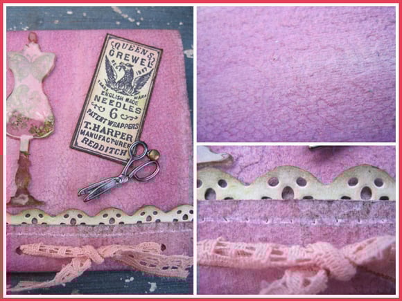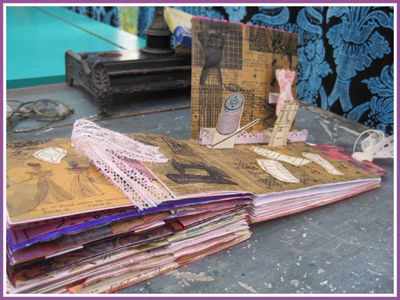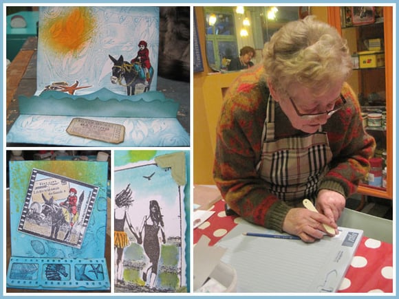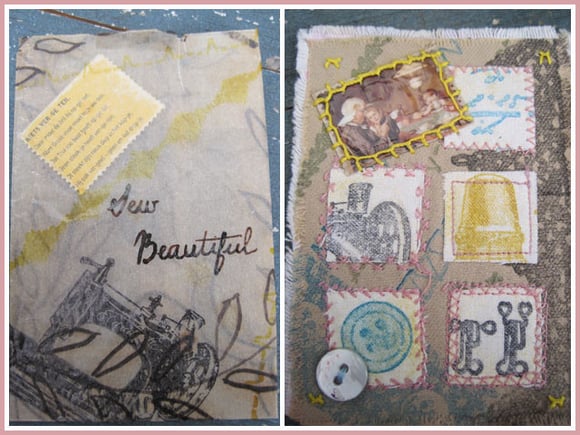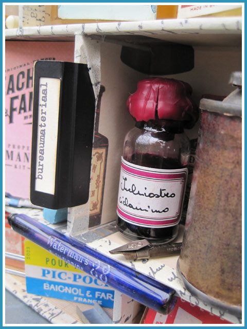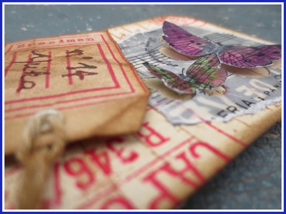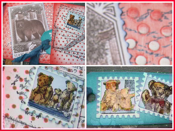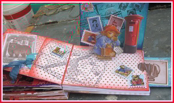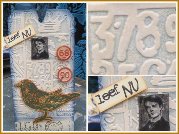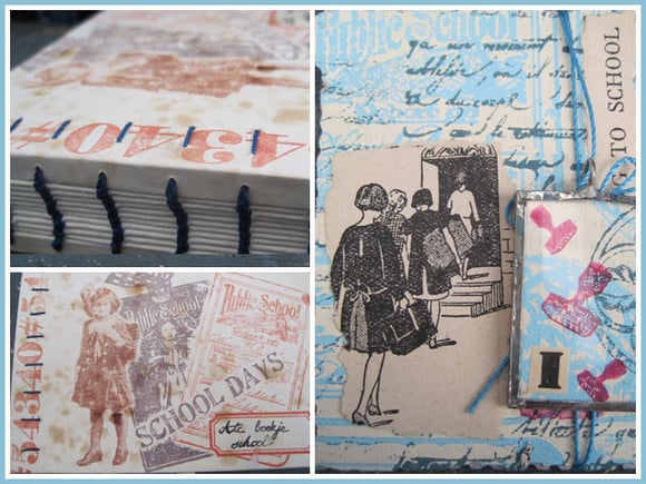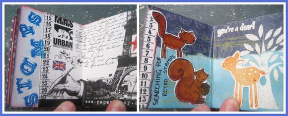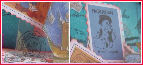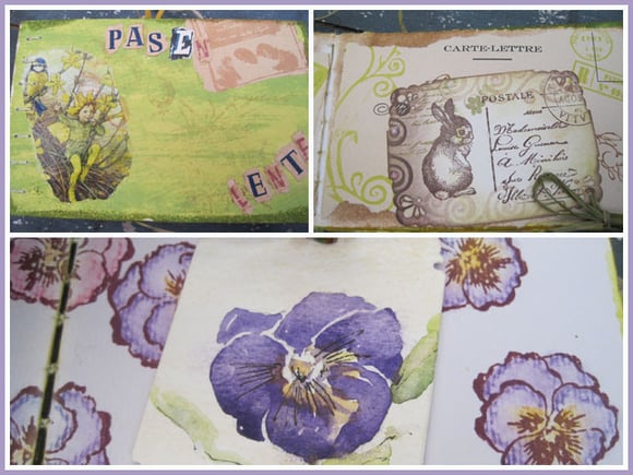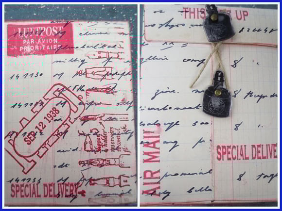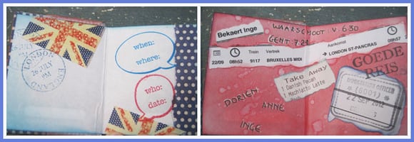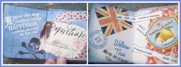 The big tag in the right pocket of the enveloppebook is decorated with stamps ( oxford impressions) and images found on the internet.