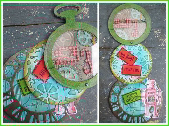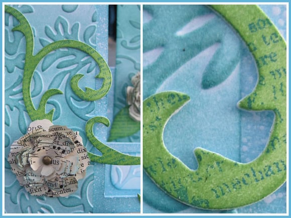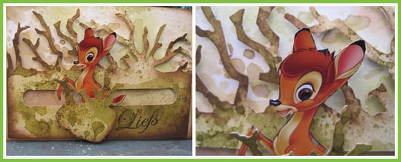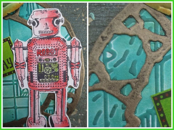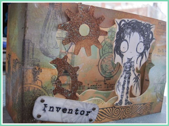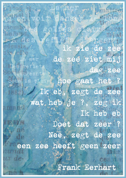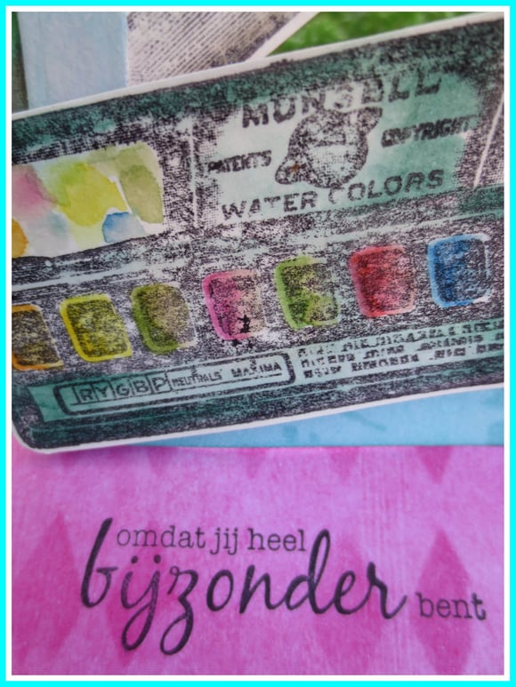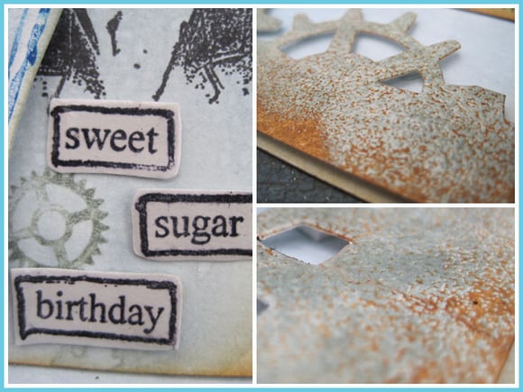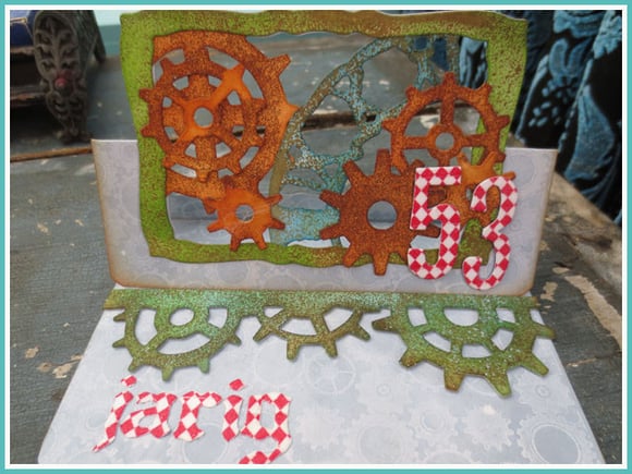 I used the gears edgedie of Tim Holtz to create the "stop" for the card. I inked the cardboard with distress ink iced spruce, embossed it with clear embossing and "flickered" some off, embossed it with the heatgun and inked with rusty hinge distress ink.