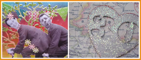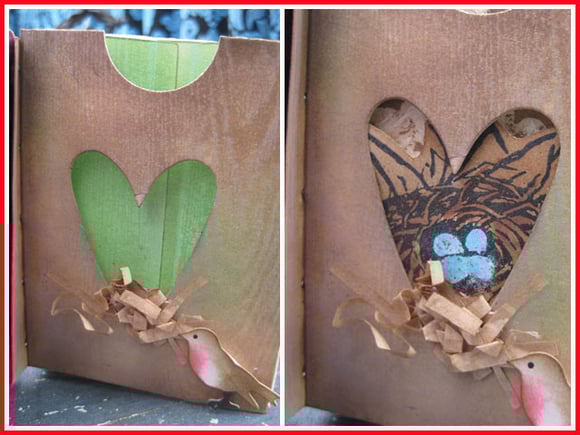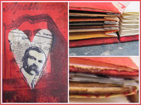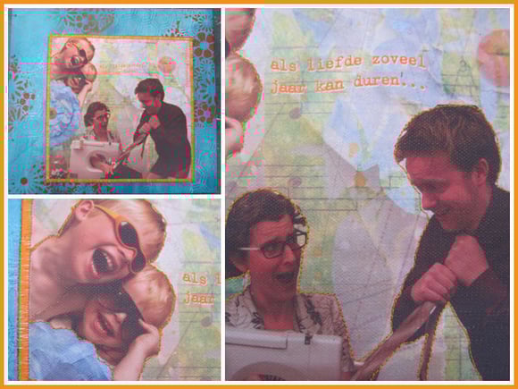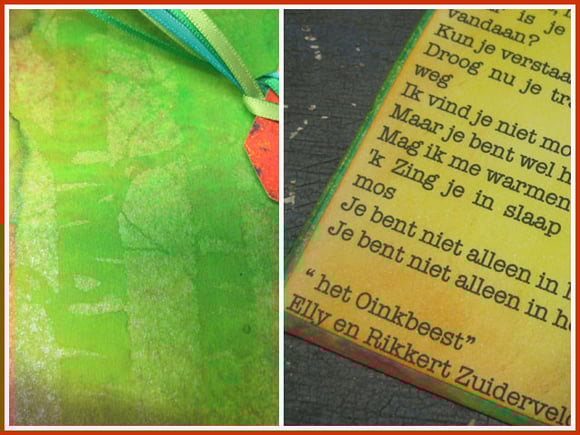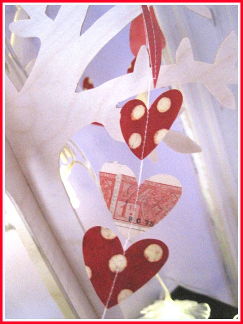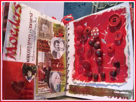 The hearts were cut with the "heartfelt " die of Tim Holtz out of all kinds of scrappapers : handstamped, gelliprinted, handmade Japanese washi papers,..