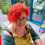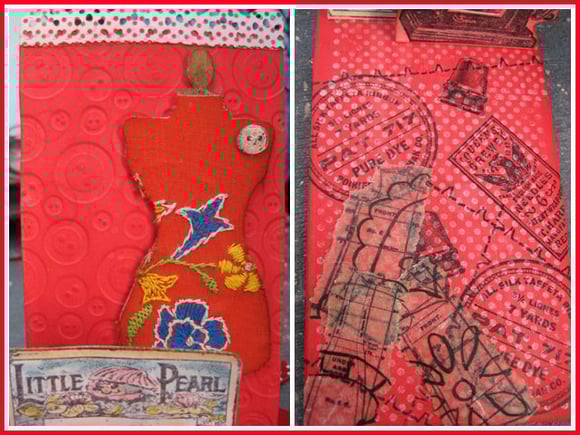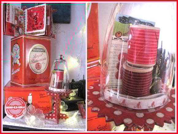 That apron died a few years ago and I made a new one, a red striped one, again with outletfabric from Oilily, reusing the Tim Holtz quotes fabric, fabric flowers made from the two previous aprons,...