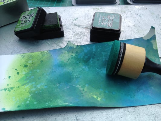 I put different shades of one color of distress inks on my mixed media mat, spritzed water and then dragged the paper through the inks.