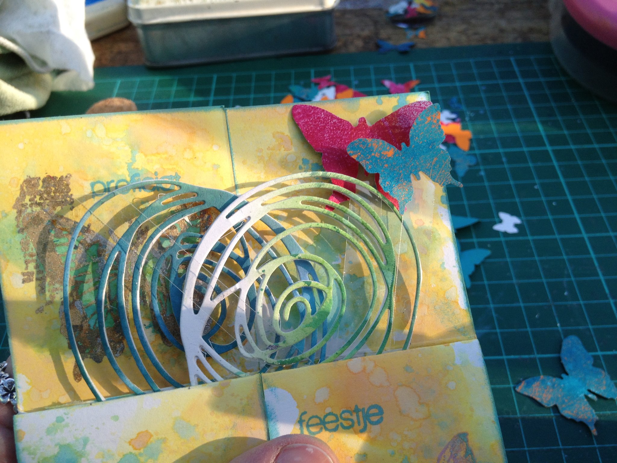 The inside of the card was decorated with distress inks and 2 wonky, psychedelic stencils van Visible Image.