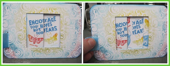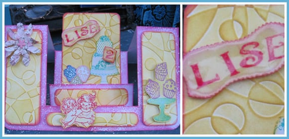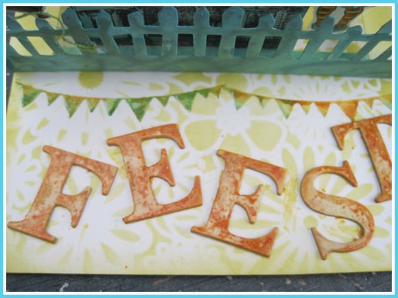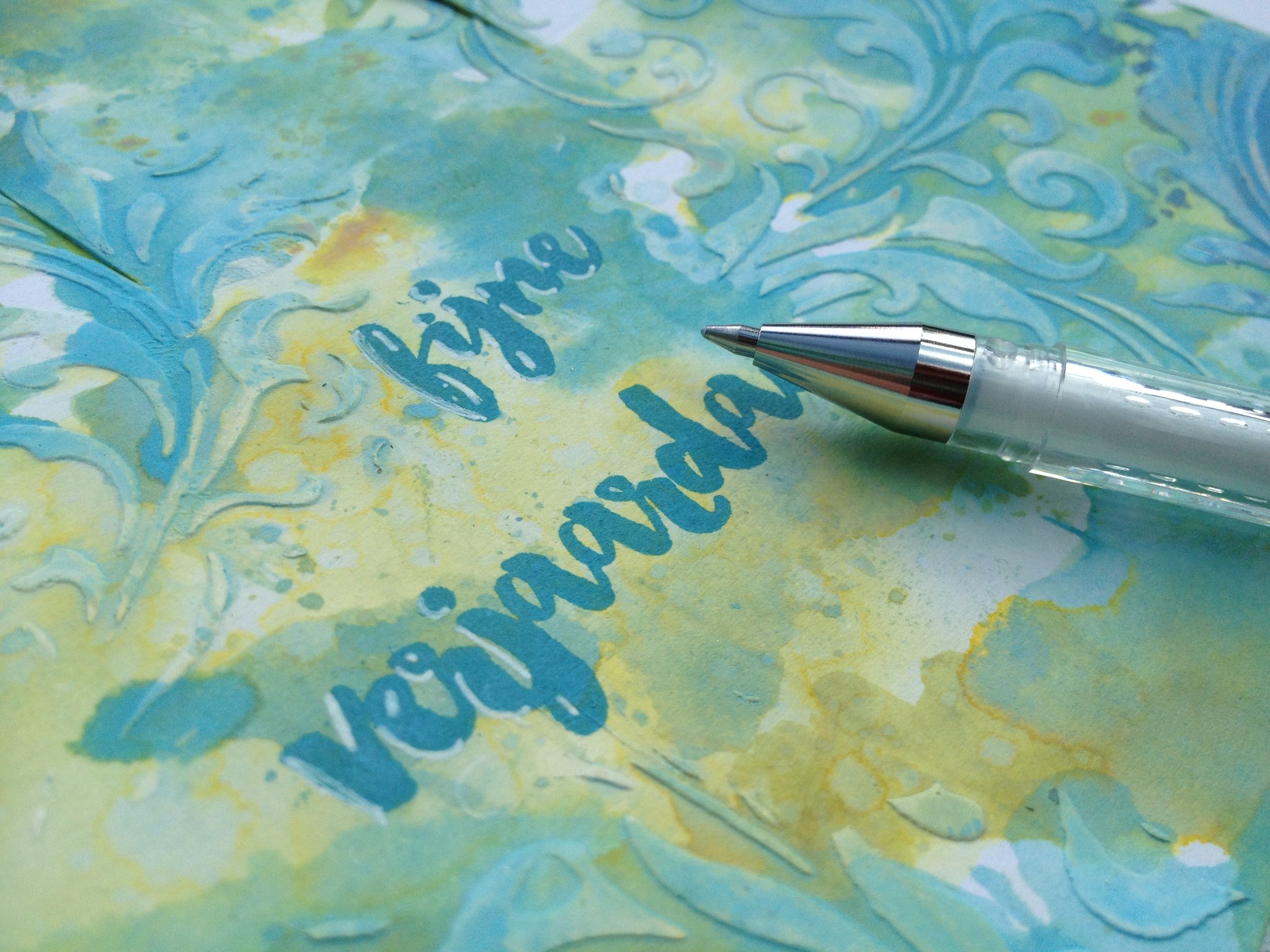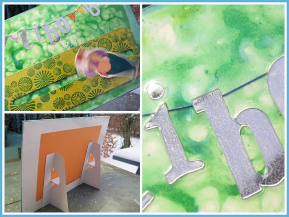 I inked the stencil with distress inks from Tim Holtz and gave the letters a little white shadow with a paintmarker to make the word pop up more.