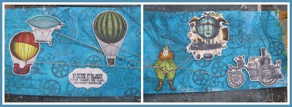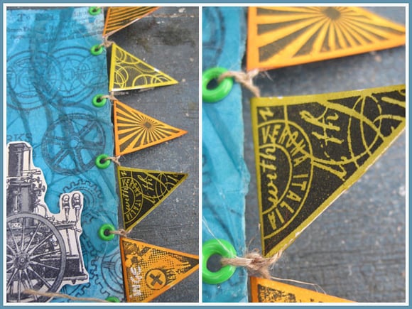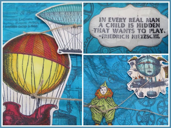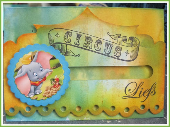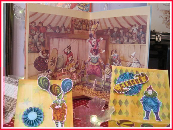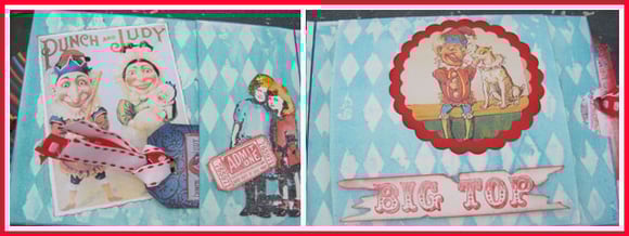 On the right is Punch with his dog. The banner ( Tim Holtz die) was stamped with the word "Big Top" from the circus stampsset of Oxfordimpressions.