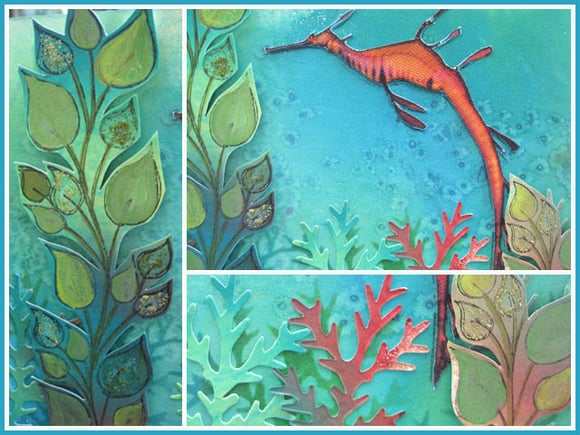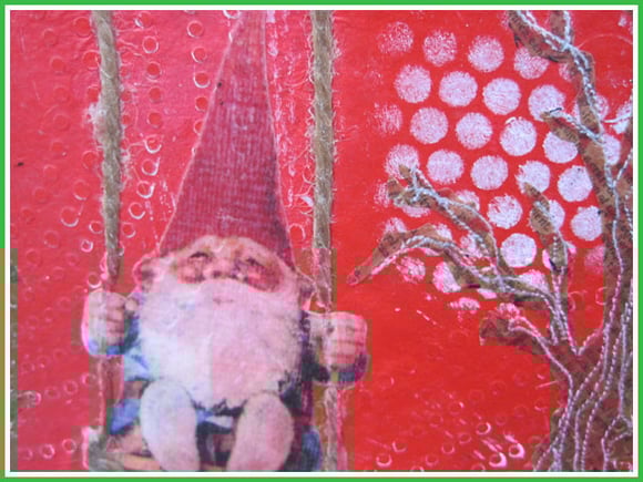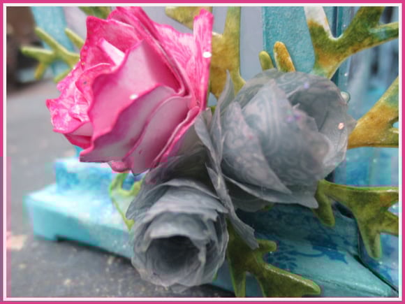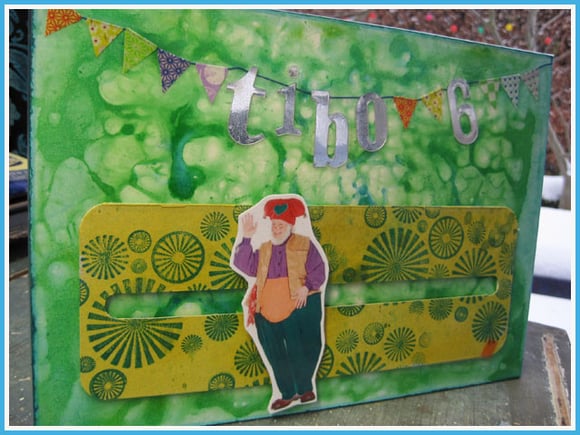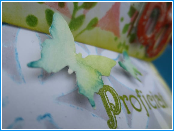 The fence is an edgedie of Tim Holtz and I colored it with his marbling technique with the distress stains picket fence, blues and greens.