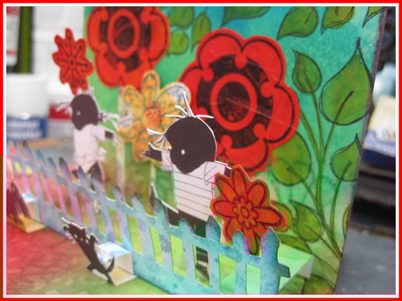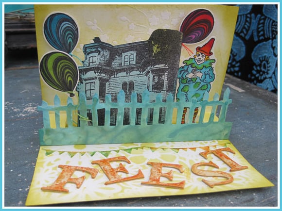 The house, the clown, the fence... were added with tabs so the card can close, but when you open it, everything "pops out"...