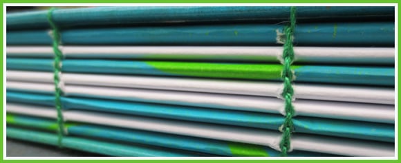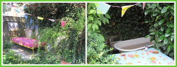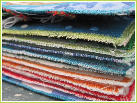 The yellow-white fabric is from an old curtain, bleached on one side by the sun, but the other side was still colorful enough.
