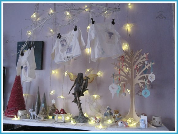 The wooden base stands on 4 old bingopieces, so there is just enough space to put the batterypack of the tiny lights in between and it is easy reachable to put the lights on and off.