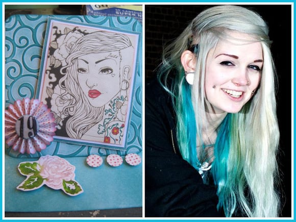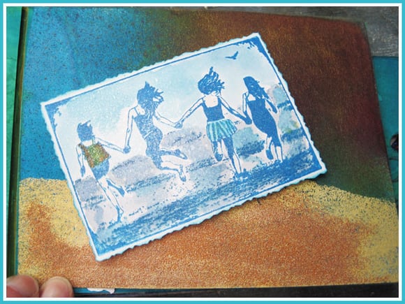 I stamped a stamp of two girls with permanent ink and colored it with distress stains and a waterbrush.