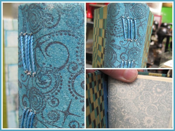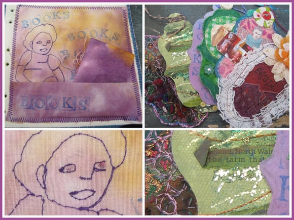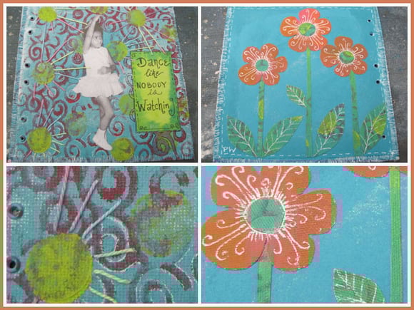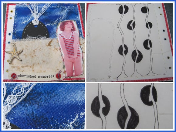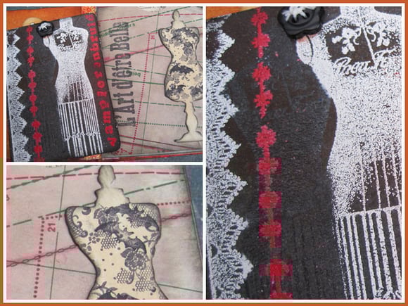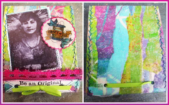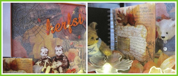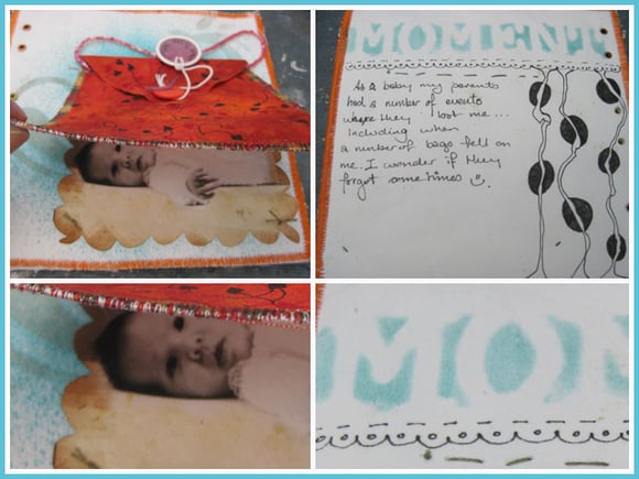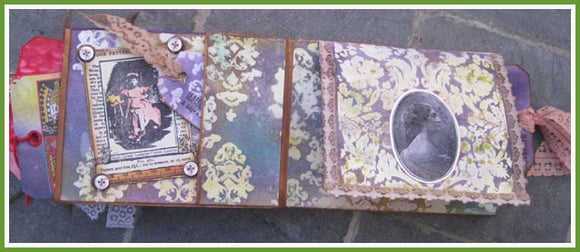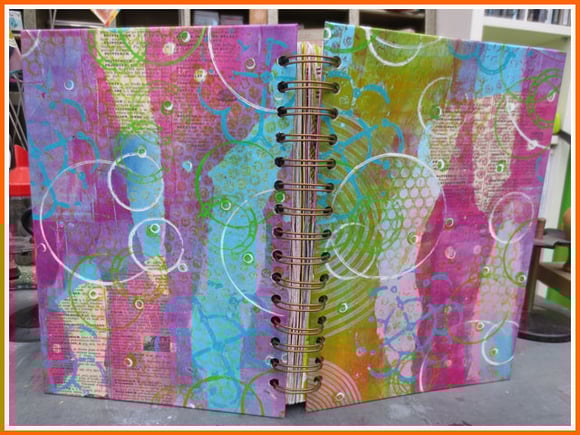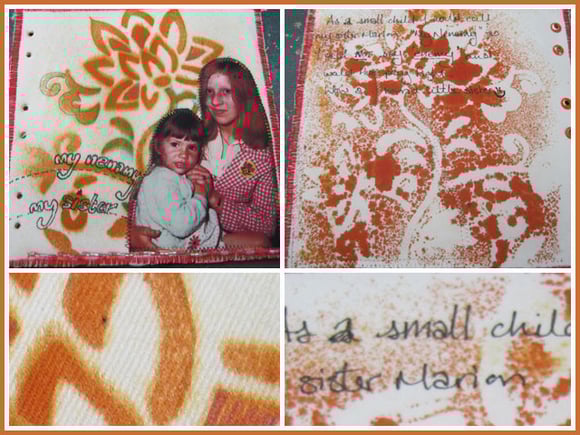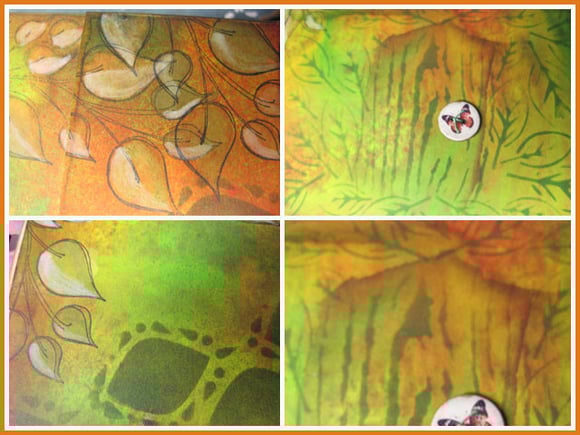 The photo shows the completed pages. Background is made with gelmedium and the harlequin stencil of the craftersworkshop.