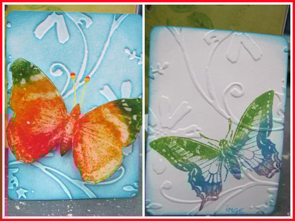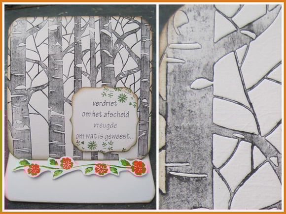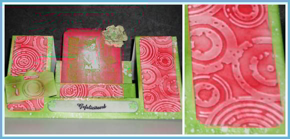 Background was embossed with one of my stencils from www.thecraftersworkshop.com ! I saw this technique on their website and had to try it out ! Awesome ! The embossing is not so very deep, but gives a great effect when the stencil was inked previously !