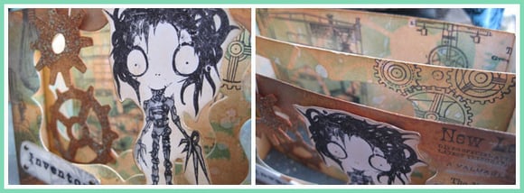 When I recieved Bea's enveloppebook about "dolls" in our round robin group, I wanted to try something mechanical out in her book too.