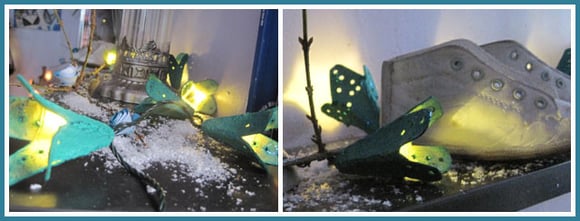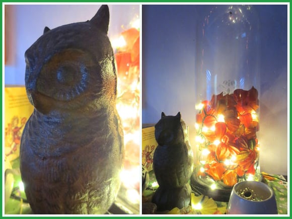 I cut a slit in the side of the wooden base so the string of the lights fit in and the glass can be put on easy.