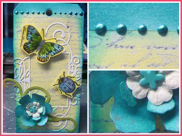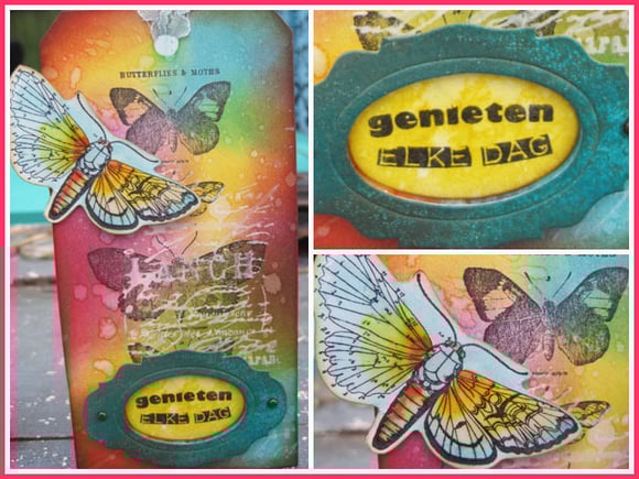 The tag was colored with distress ink spritzed with selfmade glimmermist and stamped with a stamp with fine details.